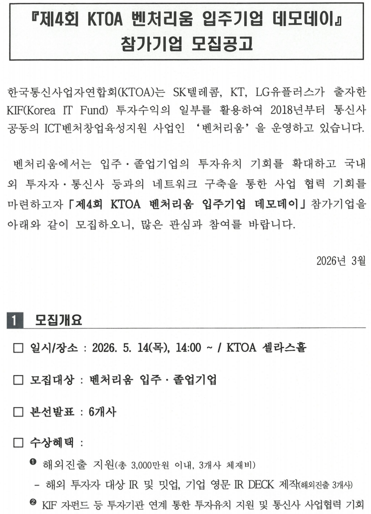 [모집공고] 제4회 KTOA 벤처리움 입주기업 데모데이 참가기업 모집공고